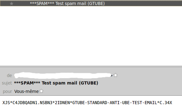 J’ai procédé à un second essai avec le courriel test GTUBE, bingo ! le message s’est bien taggé ***SPAM***.