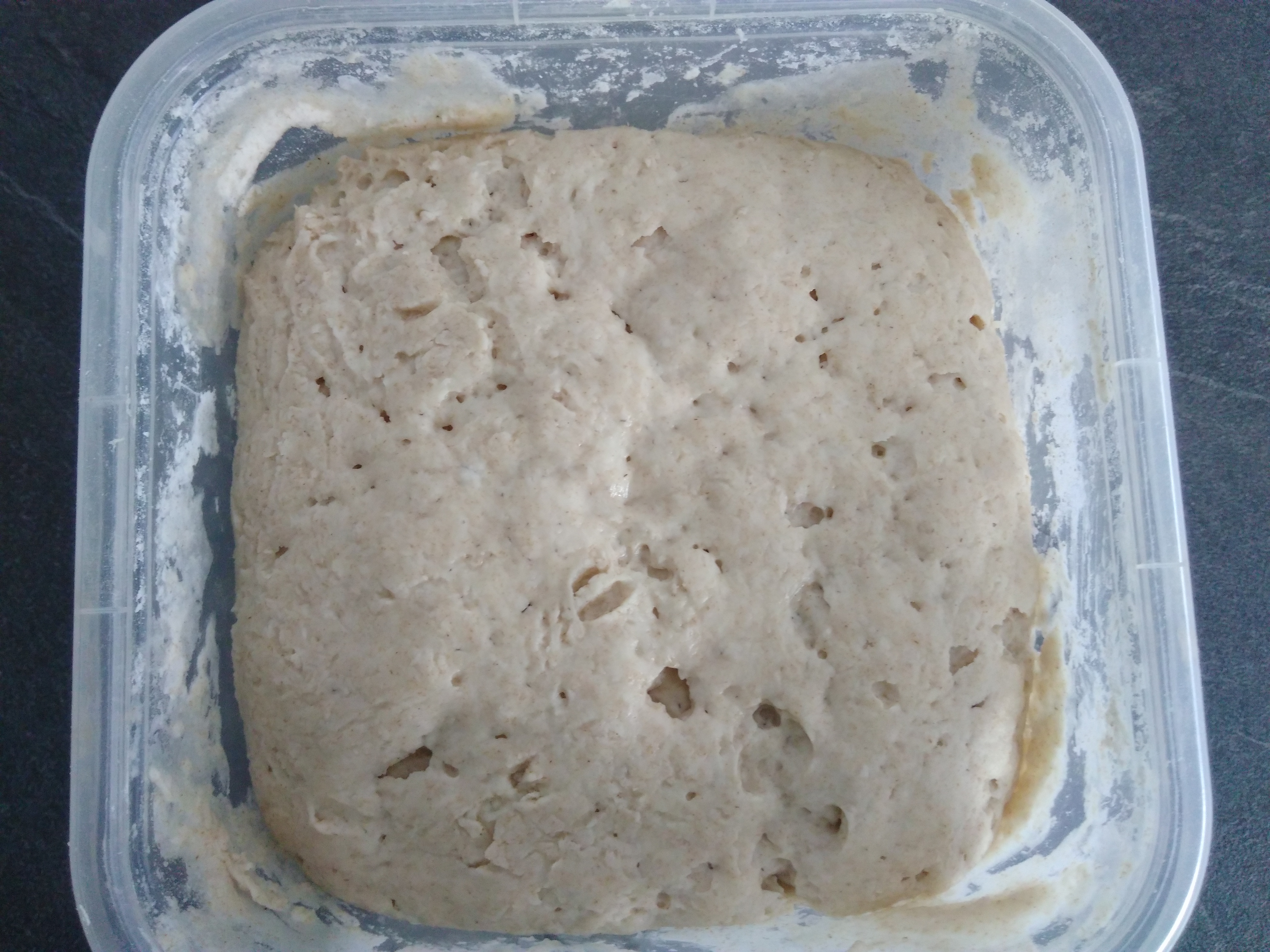 Maintenant que notre pâte est prête elle a droit à un peu de repos, c’est l’étape du pointage. Je la laisse reposer un heure à température ambiante dans une boîte fermée pour éviter qu’elle ne se dessèche. Au bout d’une heure je la dépose sur un plan de travail très légèrement fariné, pour ne pas rajouter encore de la farine à la pâte je fais ce qu’on appelle le rabat, rabattre la pâte sur elle-même 4 fois. Je replace la pâte dans la boîte encore une heure.