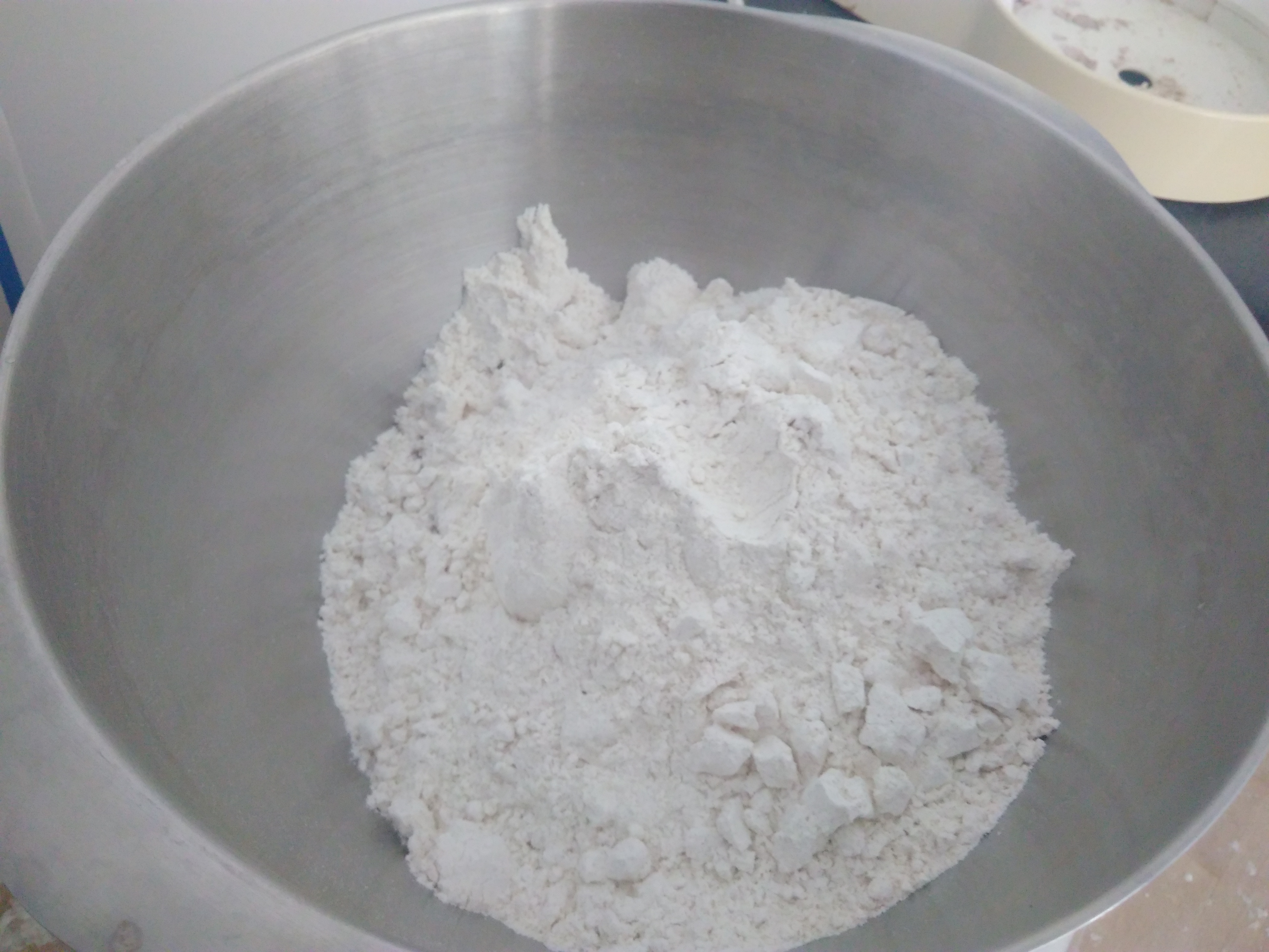 Premièrement je pèse le levain directement dans la cuve. Je travaille avec un levain dur hydraté à 50%. Par exemple pour 100g de farine dans mon levain j’ai 50g d’eau. Pour moi il est plus facile de travailler avec un levain dur, car il est moins exigeant qu’un levain liquide. 24h avant d’utiliser mon levain je le rafraichis pour avoir la quantité dont j’ai besoin et qu’il soit bien actif, généralement le soir pour le lendemain.