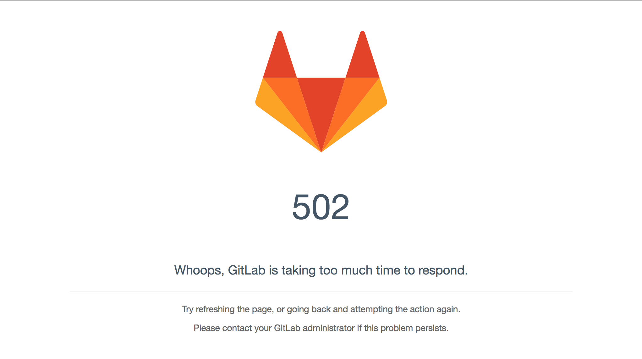Le proverbe sysadmin « Pas d’installation, ni de mise à jour le vendredi » a pris tout son sens en ce vendredi matin. Cela faisait quelques mois que je n’avais pas touchés mon serveur gitlab et donc je décide d’un pas tranquille de le mettre à jour, ainsi que le container qui l’héberge. Mais tout ne se passe pas comme prévu et une simple mise à jour de 5 mn m’a finalement bloqué une bonne partie de la matinée. La mise à jour s’est déroulée correctement, le container est monté de jessie vers stretch sans embûches. Gitlab est passé de la version 9.5 à 10.2. Je redémarre tout ce petit monde tout semble normal, pas d’anomalies ni de messages d’erreurs. Mais lorsque j’ai voulu me connecter à mon instance, celle-ci me répondait toujours la même chose : 502 Whoops, GitLab is taking too much time to respond. Et me voilà parti pour identifier le problème.
