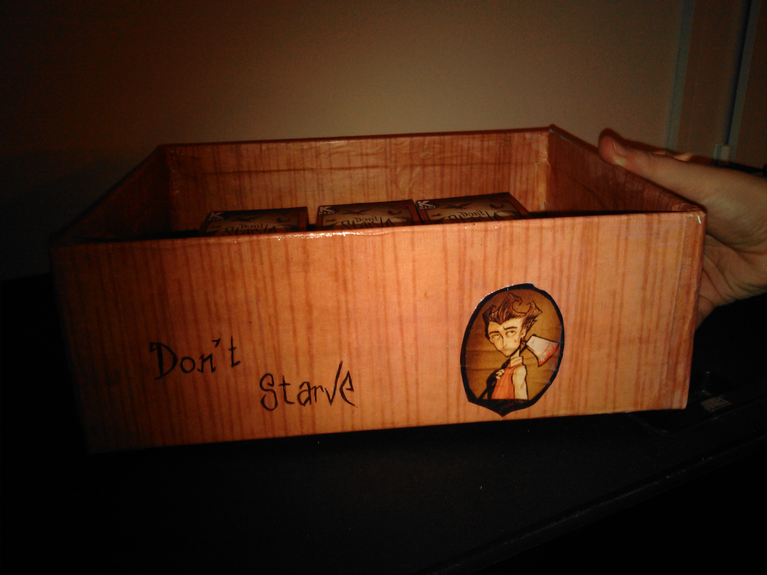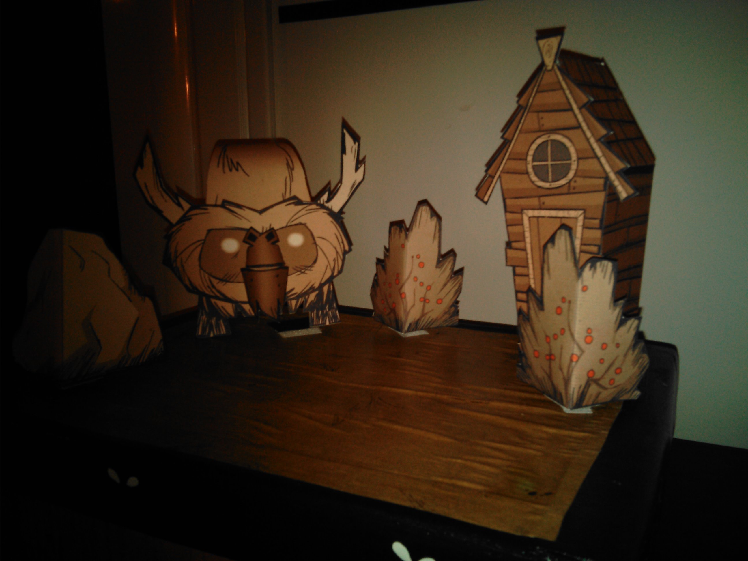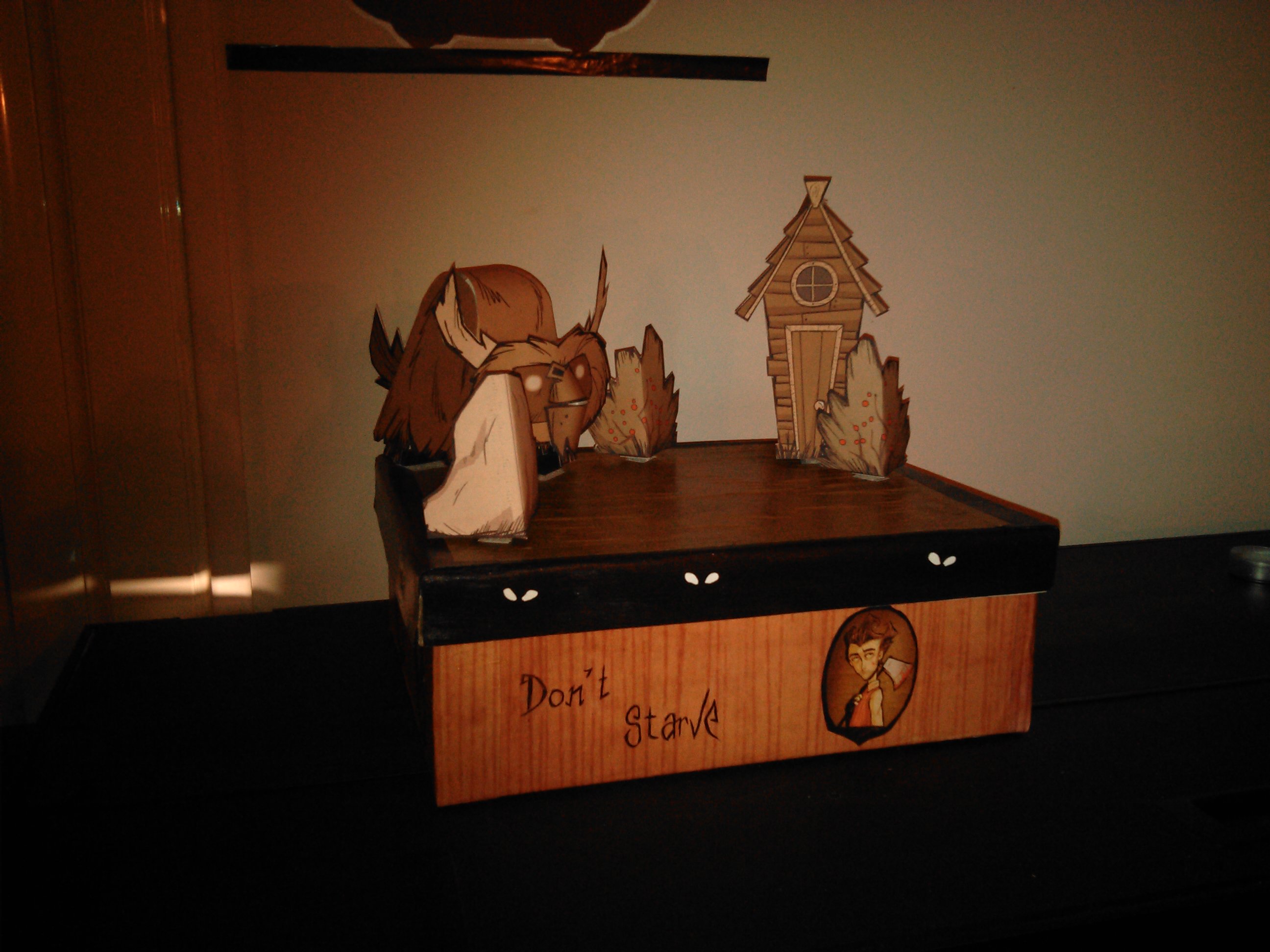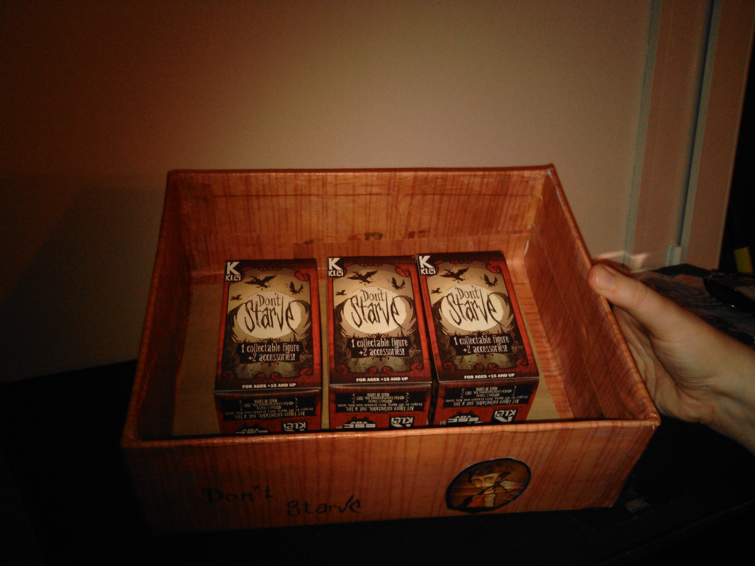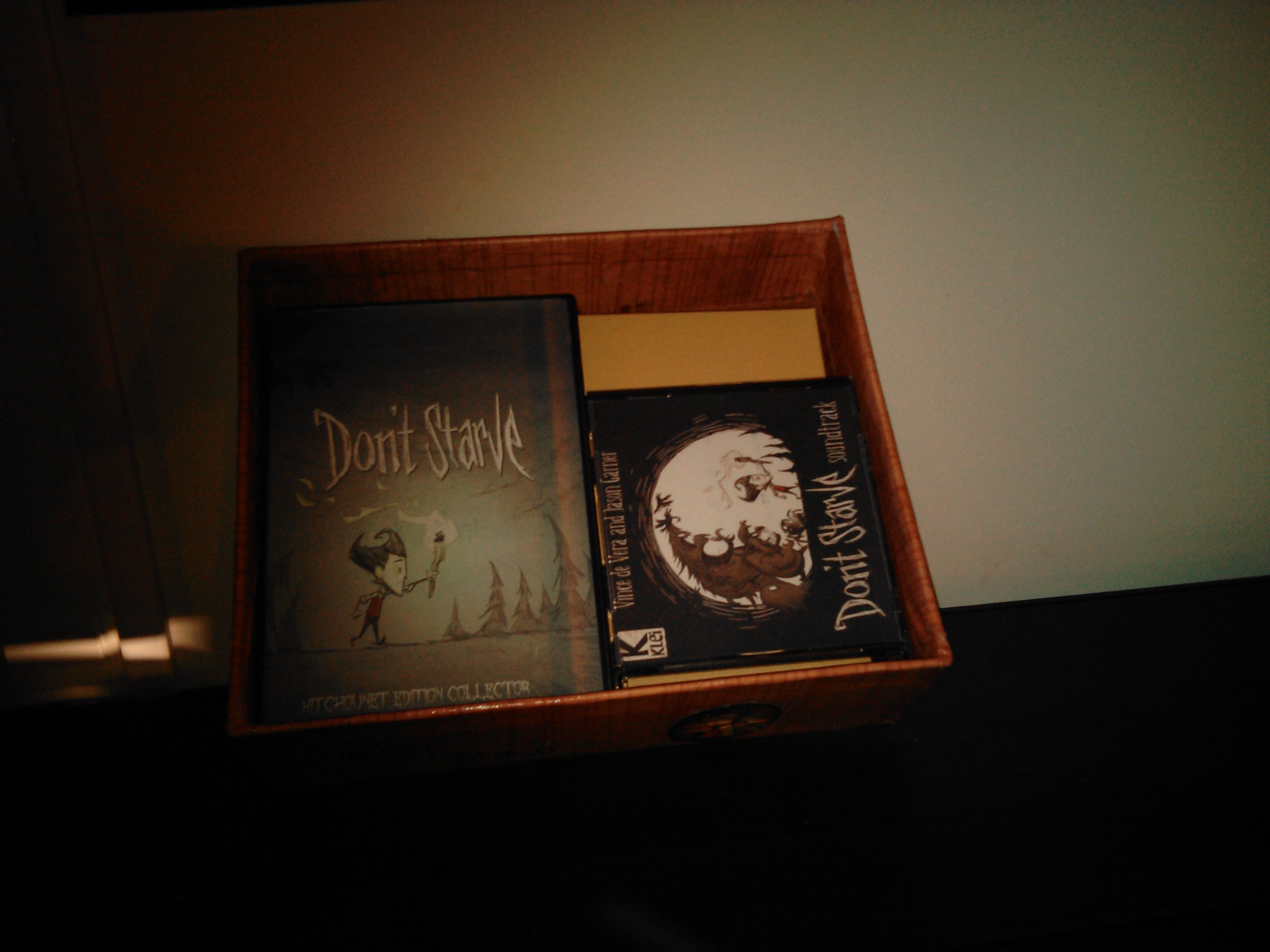 Comme le jeu est complètement dématérialisé, j’ai voulu lui créer une version collector fait par Papa et Maman qui s’est greffé au projet un peu plus tard. Je lui est donc acheté le Jeu, sa bande originale et trois figurines de collection sur la boutique du jeu. Mais pour que cela soit vraiment collector je voulais quelque-chose en plus que lui seul aurai, j’ai donc contacté par courriel les dévelloppeurs du jeu pour leur demander une photo de wilson son personnage préféré, avec un petit mot pour lui. Ils se sont montrés très enchanté par cette demande et en retour ils m’ont envoyé plein de goodies, de quoi faire un diorama, poster géant etc..